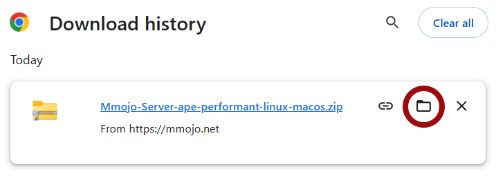 On your browser’s Download page, find “Mmojo-Server-ape-performant-linux-masoc.zip” and click its folder icon.