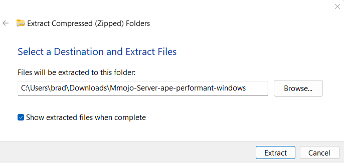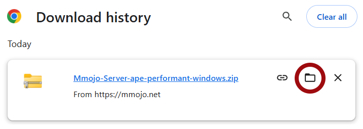 On your browser’s Download page, find “Mmojo-Server-ape-performant-windows.zip” and click its folder icon.