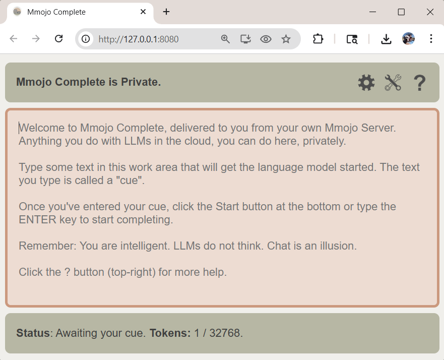 This is a multi-step guide to walk you through downloading Mmojo Server and a model file, running them, and connecting to them in your web browser. Please complete the tasks on this page, then continue to the next step using the link at the bottom.